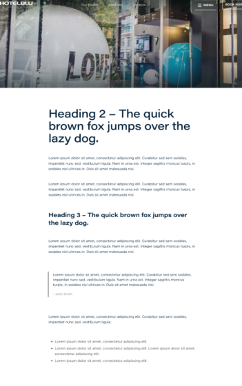 All H1 – H6 headings, a, p, ul, ol, and blockquote tags must be styled without reference to the element class directly through the tag ( h1 {some style here} ). It is allowed to style through the parent selector, which will be used as a wrapper on the single blog post page