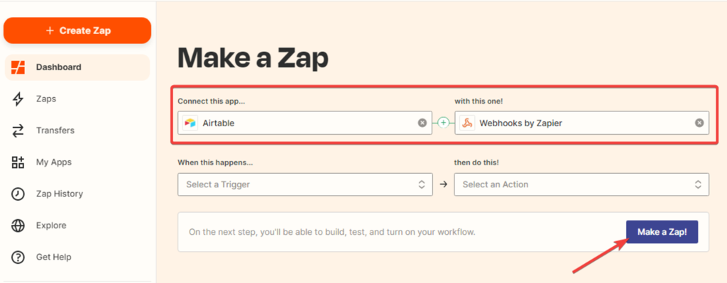 1. Creating a Zap. While on the “Dashboard” tab, select the applications “Airtable” and “Webhooks by Zapier,” then click the “Make a Zap” button.