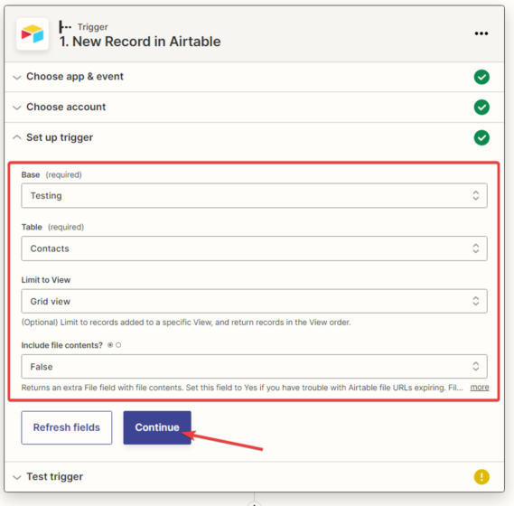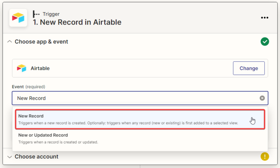 2. Selecting the trigger event… Choose “New Record” from the dropdown list and click “Continue.” The trigger will activate when a new record is created in Airtable.