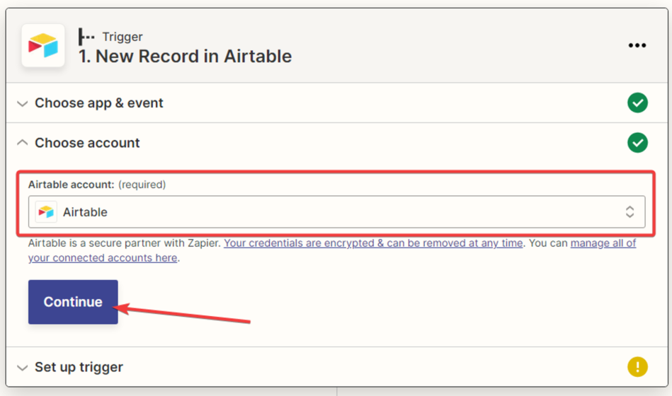 3. Next, you need to select your “Airtable” account and click “Continue.”