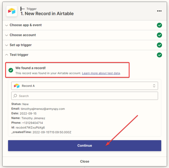 6. The next step is for Zapier to find the record in “Airtable” and display all the information available in its profile. Click the “Continue” button.