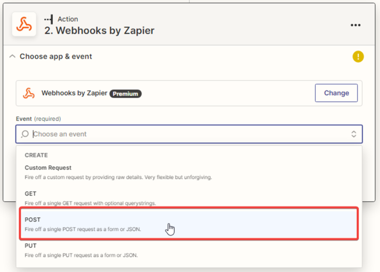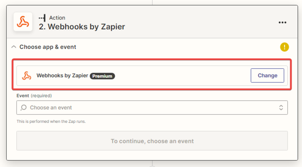 If Zapier lacks an application or event for a specific application, you can use the Webhooks by Zapier application to send an API request to the required application.