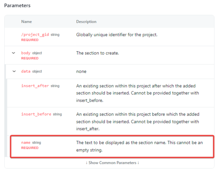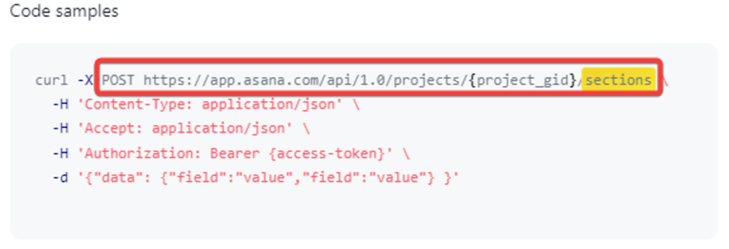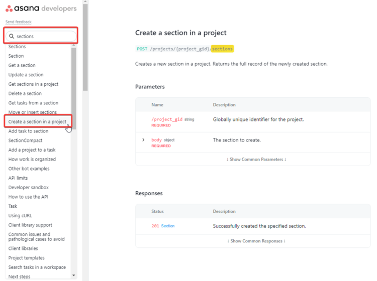9. Next, you need to fill in the fields using the API documentation for Asana (see https://developers.asana.com/docs). Search for the relevant documentation on creating a section.