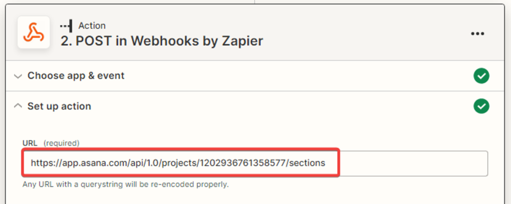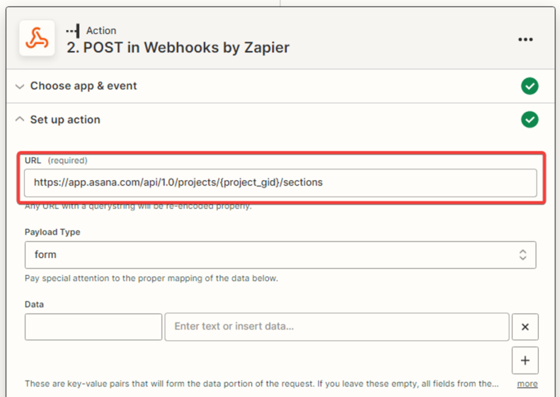 To fill in the URL field, you need to copy the requested URL from the same section of the documentation and paste it into the Zapier field.