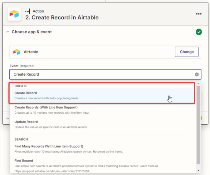 8. In the next window, you need to specify the action that will be performed when a new file is uploaded. For the ‘Airtable’ application, choose ‘Create Record’ and click ‘Continue’.
