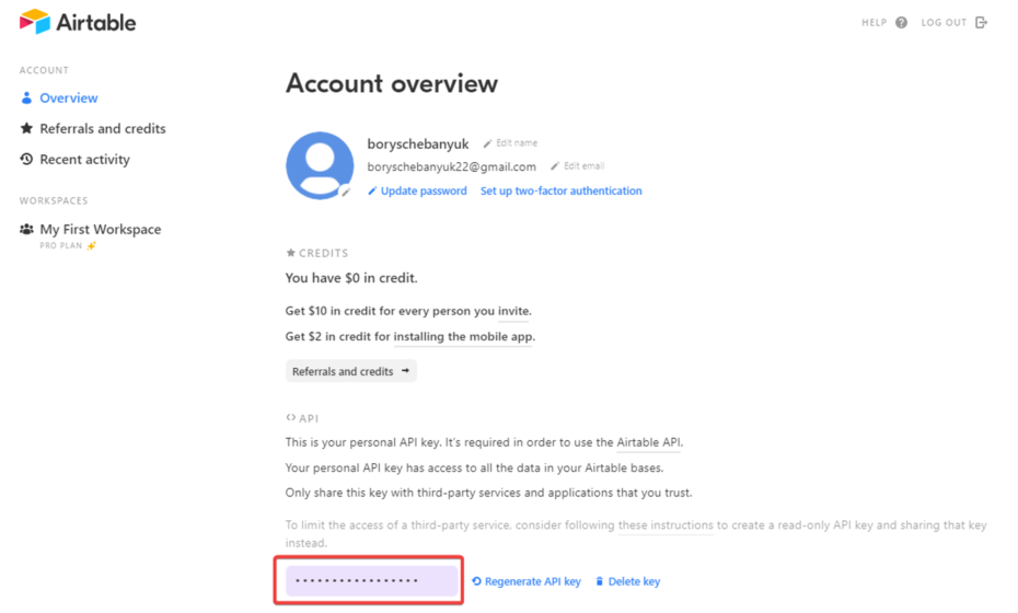 9. Next, you need to connect the ‘Airtable’ account. In your Airtable account, generate an API key.