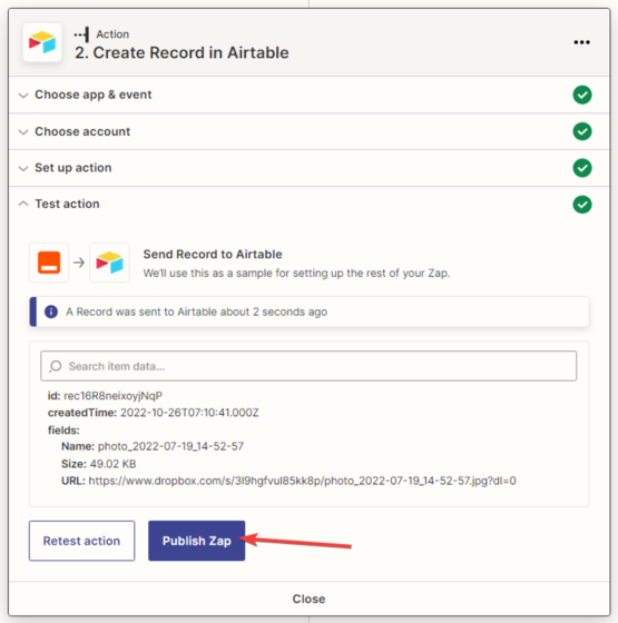 11. You need to test the connection between ‘Dropbox’ and ‘Airtable’ by clicking the ‘Test action’ button.