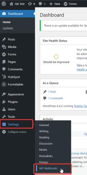 5. Next, you need to open the WordPress application and configure the webhook. On the toolbar, click “Settings” – “WP Webhooks.”
