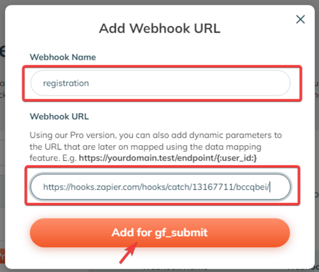 7. In the opened window, assign a name to the webhook and paste the copied Zapier URL. Click the “Add for gf_submit” button.