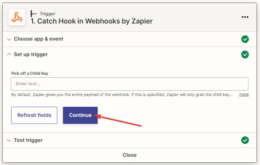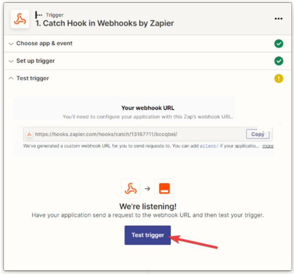 Setting up the trigger event in the Zapier application “Webhooks by Zapier”: