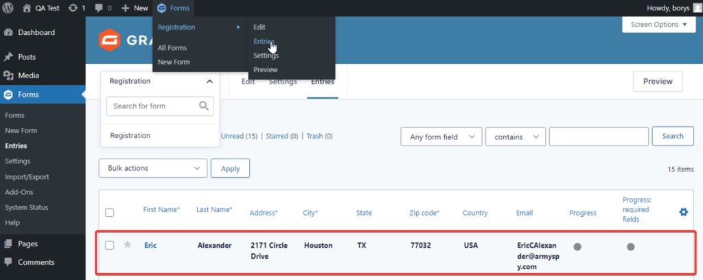 10. The next step is for the system to find the record in Gravity Forms. Navigate to Forms – Registration – Entries.