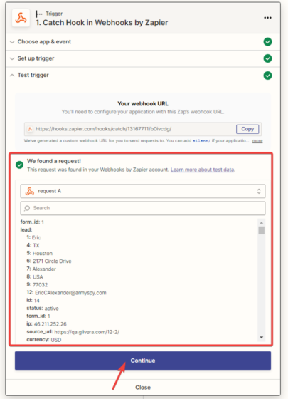 13. Next, you need to set up the connection between the “Webhooks by Zapier” application and “HubSpot” in Zapier. Fill in the data in the provided fields. After filling in all the fields, click the “Continue” button.