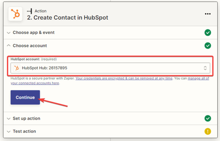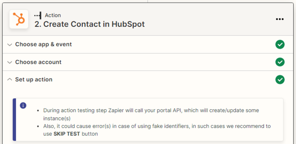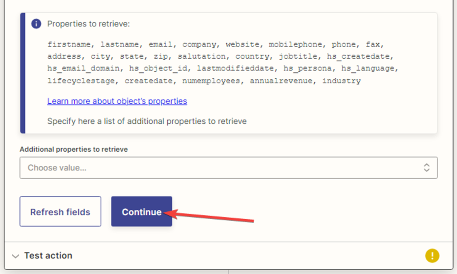 Setting up the action in the “HubSpot” service