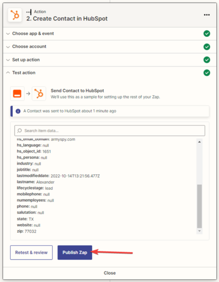 16. After a successful test, click the “Publish Zap” button.