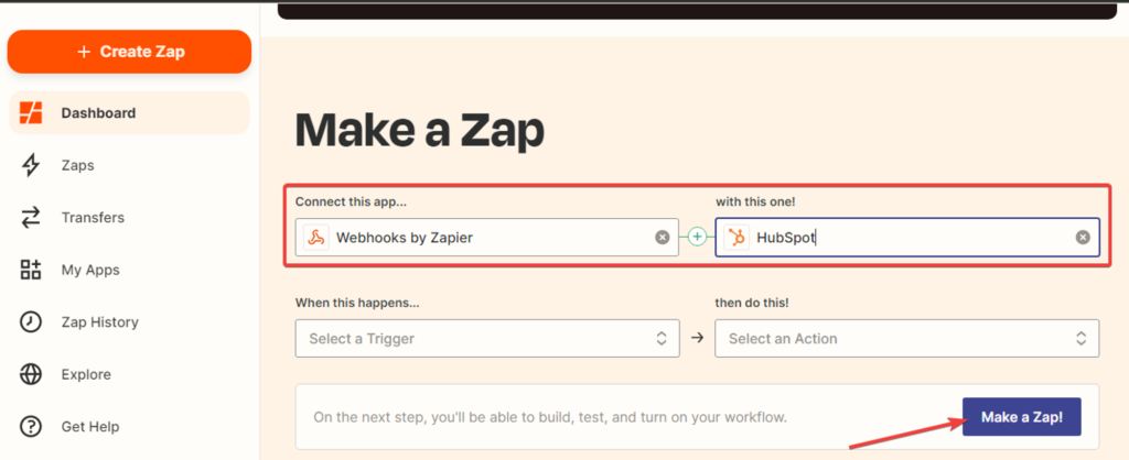 - Creating a Zap. While on the “Dashboard” tab, select the “Webhooks by Zapier” and “HubSpot” applications, then click the “Make a Zap” button: