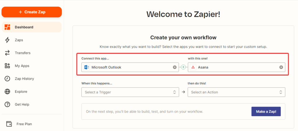 - Creating the Zap. When on the “Dashboard” tab, select the Outlook and Asana apps and click on the “Make a Zap” button: