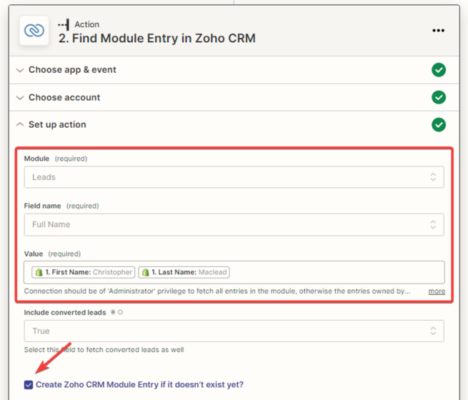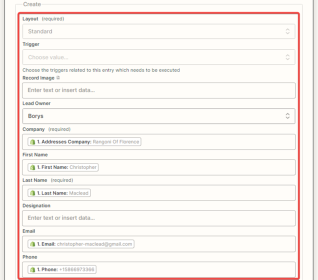 8. Next, you need to set up the connection between the “Shopify” and “Zoho CRM” applications. Fill in the required fields that will be matched with the data from the new customer, using variables from the drop-down list. After that, check the box to ensure that a record is created in the Zoho CRM module if it is absent.