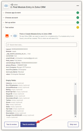 - Zapier checks if the new customer exists in the Zoho CRM database. If the customer is not present, Zapier creates a new record.