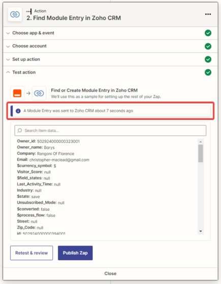 10. Checking the test data on the “Zoho CRM” service in the “Leads” tab. Since there was no existing record in the system, Zapier created a new entry.