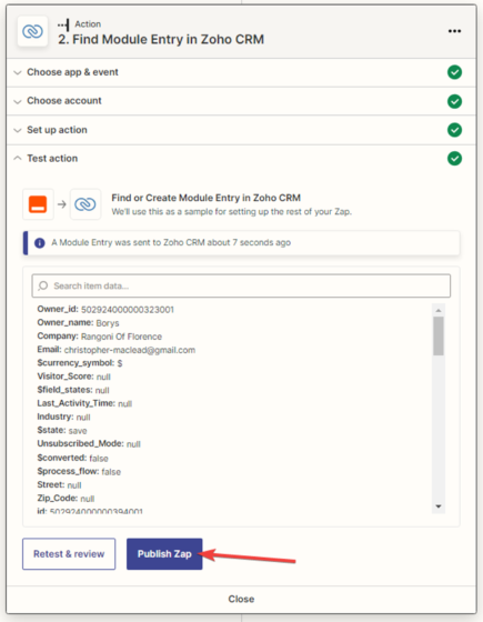 11. After a successful test, click the “Publish Zap” button.